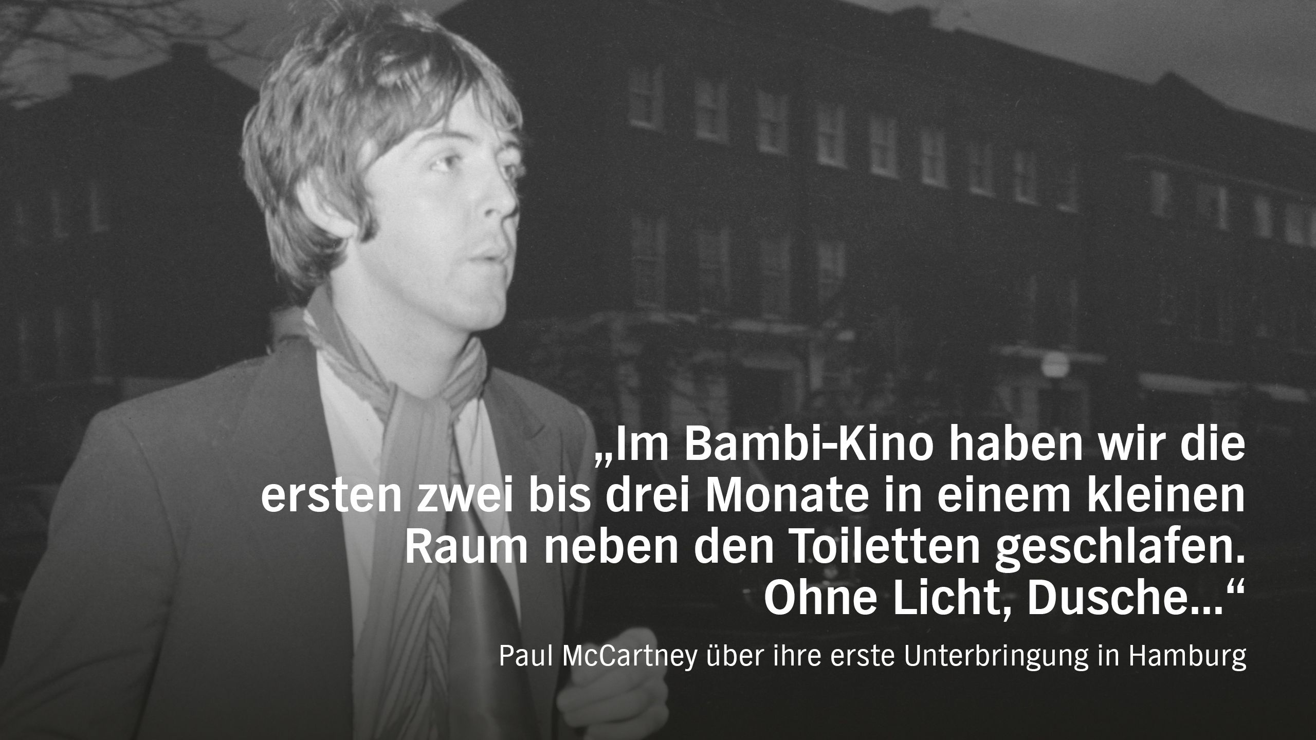 Ja, mit vielen O-Tönen aus dem Archiv. Ich habe ganz hinreißende O-Töne gefunden. Wie George Harrison auf Deutsch ein Rundstück warm und eine Tasse Tee bestellt. Wie Paul McCartney von der miesen Unterkunft ‚im Bambi Kino, bei die Toiletten!‘ erzählt. Oder wie John Lennon ganz offen über Aufputschmittel spricht, ohne die sie damals nicht durchgehalten hätten: ‚Of course I was taking pills in Hamburg‘. Auch eine Rarität konnte ich ausfindig machen: Das erste Radiointerview der Beatles, das sie dem Radiosender eines Liverpooler Krankenhauses gaben. Dort erwähnen sie auch Hamburg.