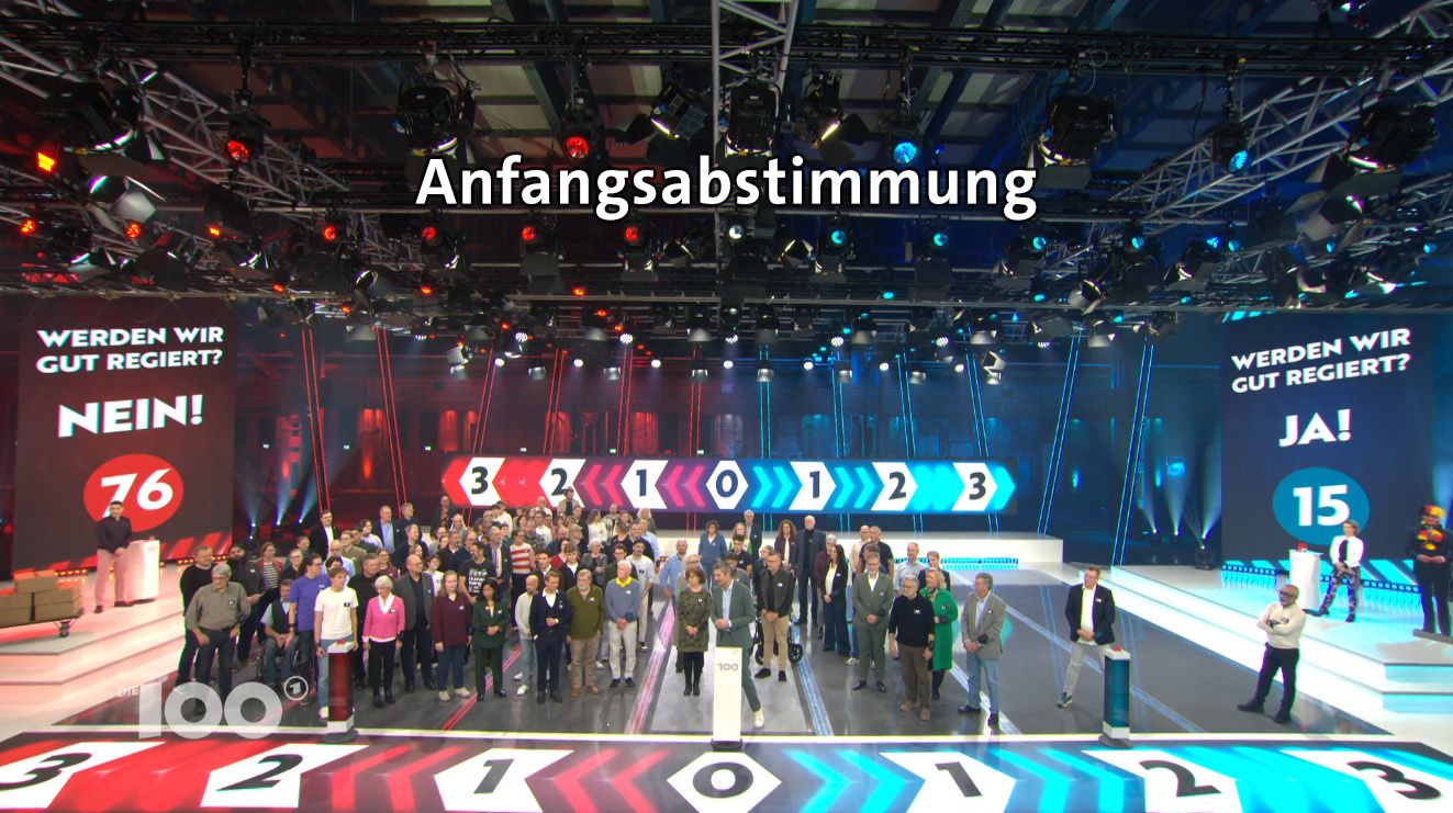 „Die 100“ ist eine Show, in der Deine Meinung gefragt ist! Es geht um eine kontroverse Frage zu einem gesellschaftlich relevanten Problem. Zwei Journalisten tragen Pro- und Contra Argumente zu der Frage vor. Anschaulich und unterhaltsam. Einhundert Menschen beziehen dazu Stellung. Mit ihren Füssen. Nach jedem Argument. Eine Seite des Studios steht für „Pro“, die andere Seite für „Contra“. Welche Argumente überzeugen, welche nicht? Wer ändert seine Meinung im Laufe der Sendung und wer nicht?