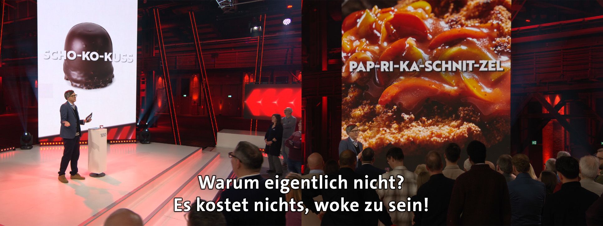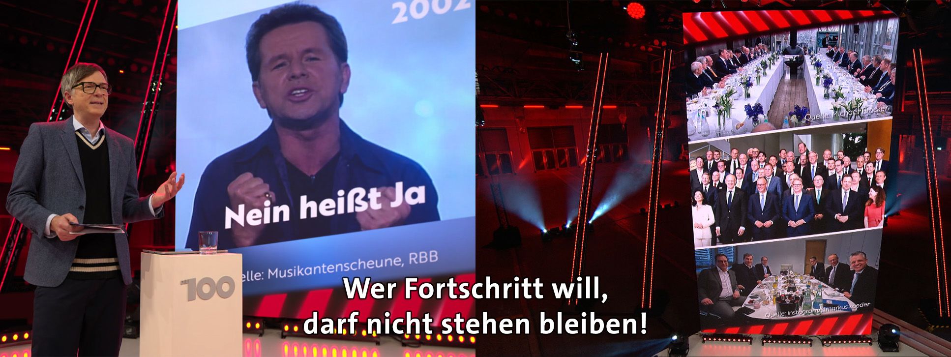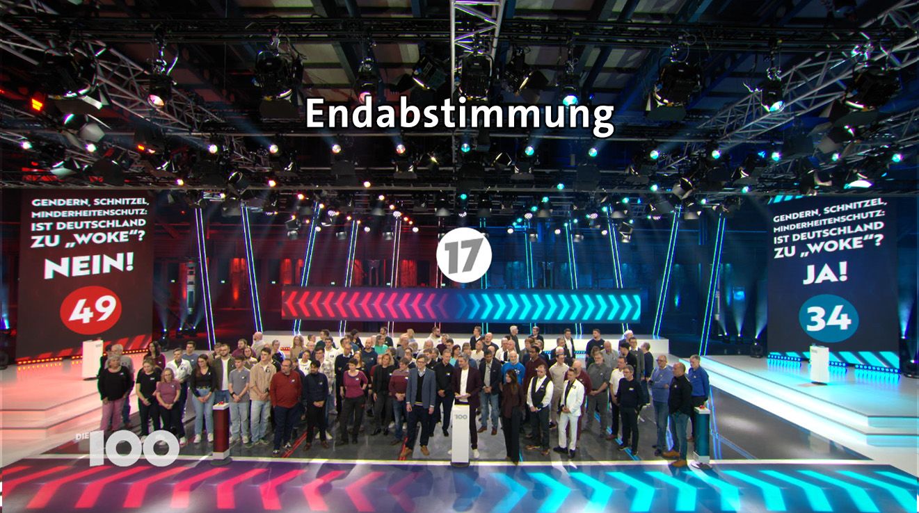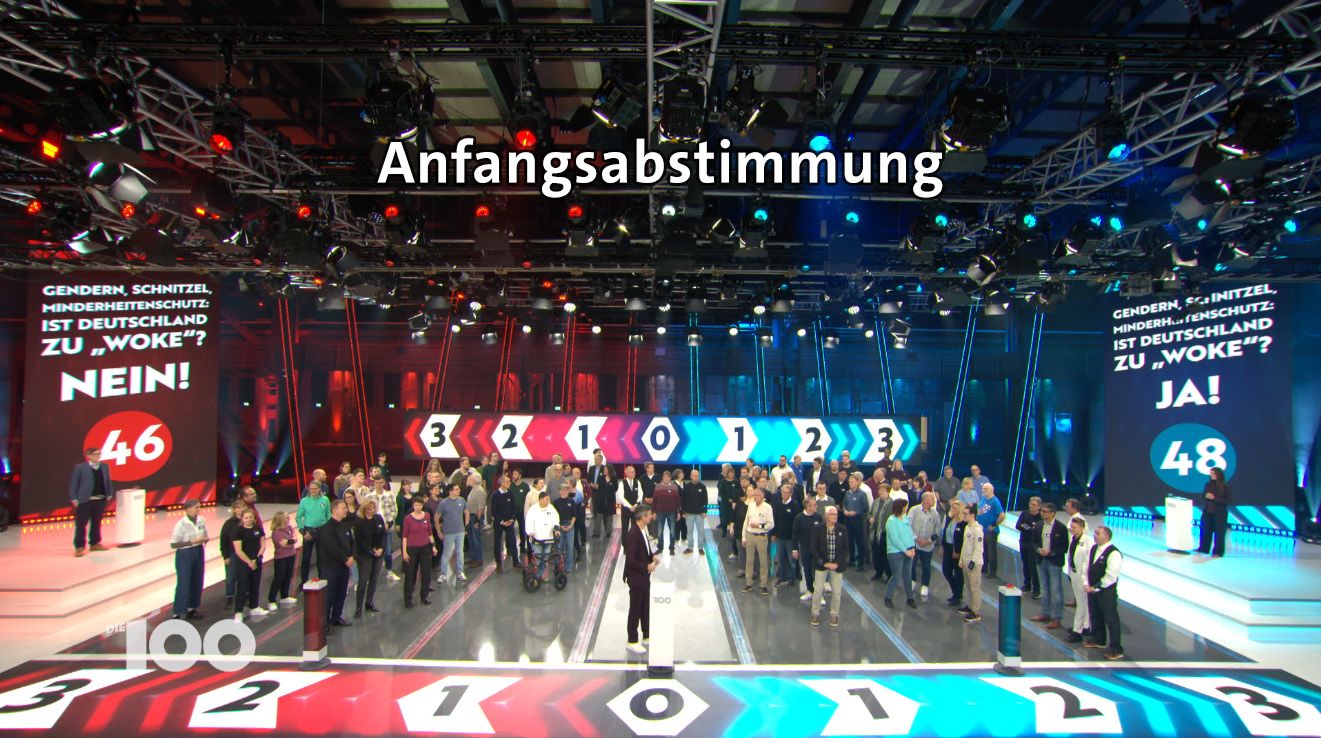 „Die 100“ ist eine Show, in der Deine Meinung gefragt ist! Es geht um eine kontroverse Frage zu einem gesellschaftlich relevanten Problem. Zwei Journalisten tragen Pro- und Contra Argumente zu der Frage vor. Anschaulich und unterhaltsam. Einhundert Menschen beziehen dazu Stellung. Mit ihren Füssen. Nach jedem Argument. Eine Seite des Studios steht für „Pro“, die andere Seite für „Contra“. Welche Argumente überzeugen, welche nicht? Wer ändert seine Meinung im Laufe der Sendung und wer nicht?