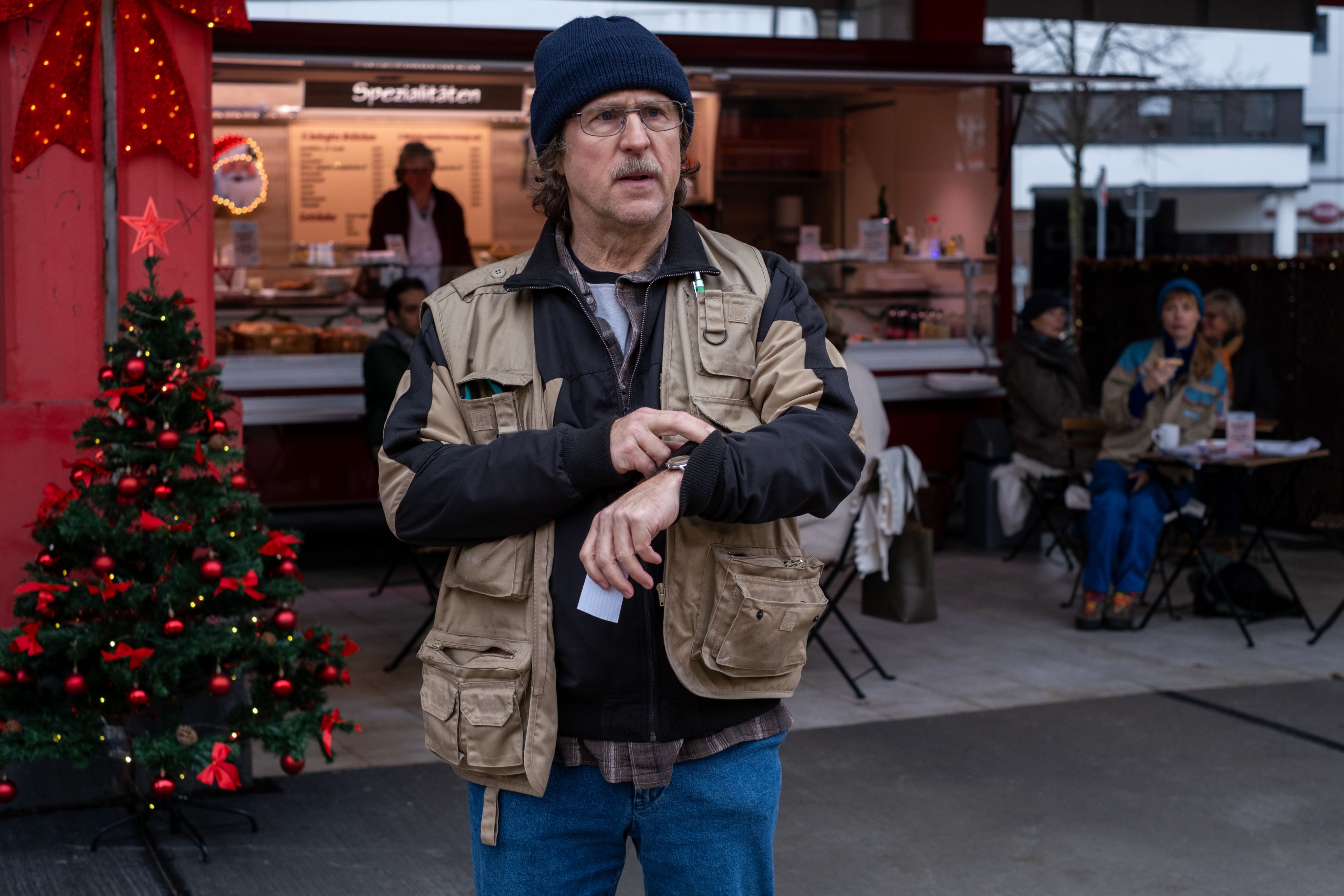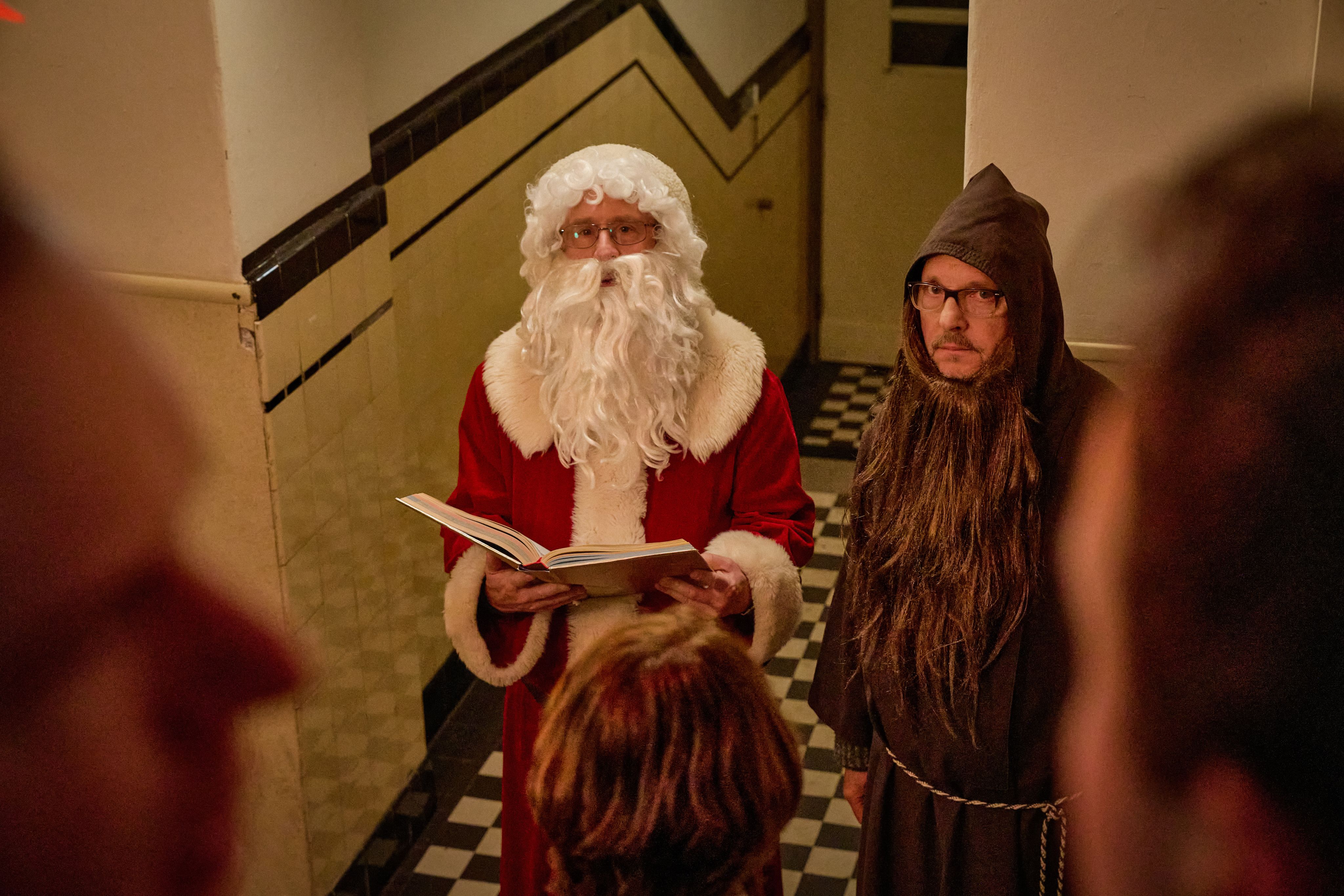 Er ist berührend, ohne kitschig zu sein. Wenn in einem Weihnachtsklassiker der Kunstschnee rieselt und die Geigen einsetzen, wird es für mich unerträglich. Bei uns regnet es eben. Gleichzeitig haben wir uns aber nicht gescheut, eine frohe Botschaft rauszuhauen. Von Liebe und Zusammenhalt. Auch wenn wir davon etwas anders erzählen als sonst vielleicht üblich. Bei uns gibt es die verwirrte Oma aus der dritten Etage, ihr gegenüber den Öko-Spießer auf Kohlsuppendiät samt Partner, dann die überforderte Mutter mit dem Arschlochkind aus dem zweiten Stock, den Prange kurioserweise wie einen gleichaltrigen Kumpel behandelt, und im Erdgeschoss die beiden Aufpasser – das ist ja nicht unbedingt das typische Personal für eine Weihnachtskomödie. Aber gerade weil die Figuren so eigenwillig, schräg und liebenswert sind, entwickelt sich im Spiel eine große „vorweihnachtliche“ Magie.