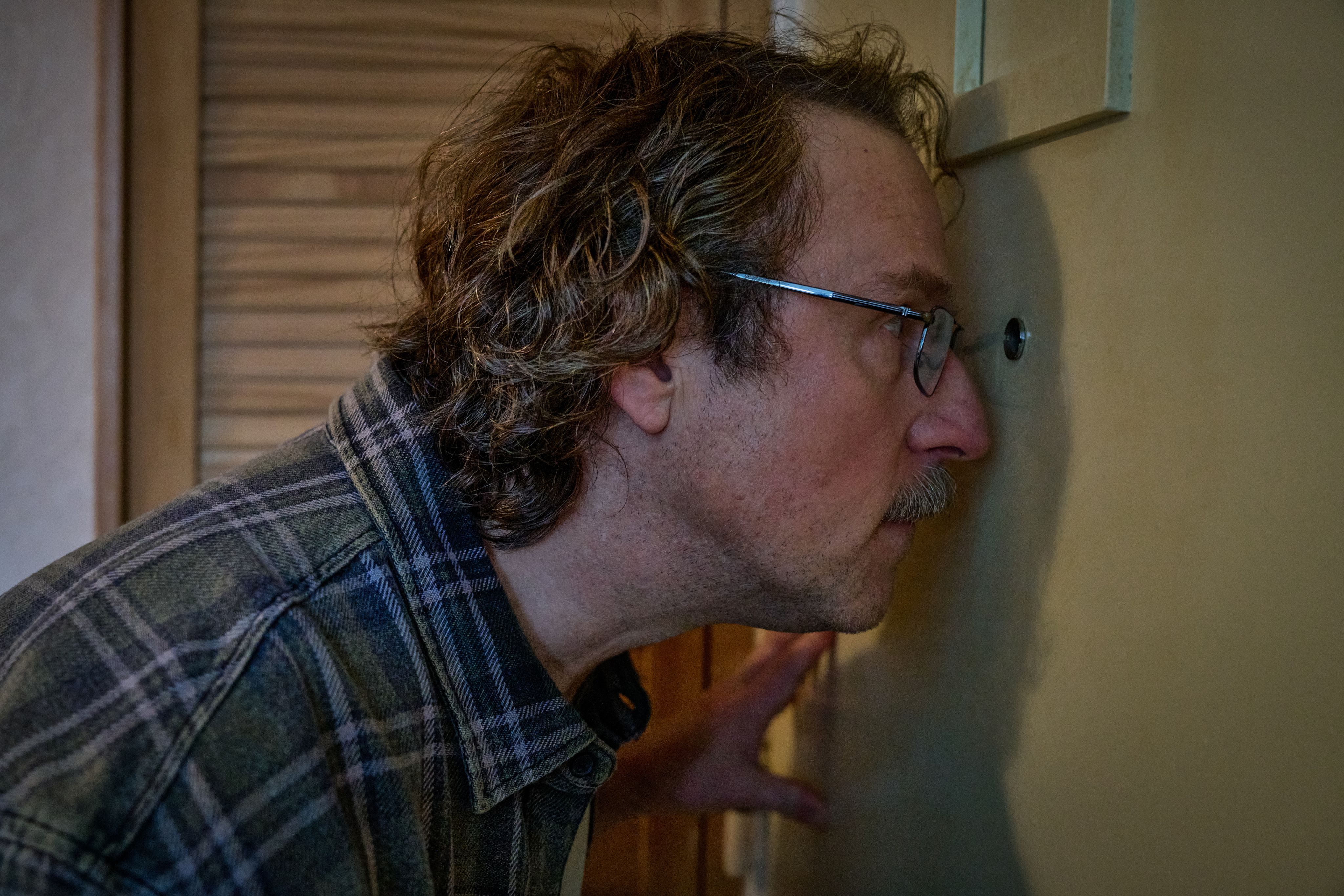 Andreas Altenburg: Er beobachtet die Welt aus dem Türspion, als wäre das Leben eine Peepshow. Er kann hinter der Wohnungstür natürlich mit sehr viel Selbstbewusstsein stehen, aber er erstarrt, sobald er ertappt wird und der Blick zurückfällt. Dieses Ausspähen, dieses Übergriffige, was zutiefst menschlich ist, trage ich persönlich auch ein bisschen in mir, ohne darin unbedingt einen Handlungsauftrag zu sehen. Prange guckt nur mal kurz durch die Luke, um dann in seiner Gedankenwelt hoch und höher zu fahren. Weil er allein ist, ohne Korrektiv, und es nicht unmittelbar reflektiert wird.