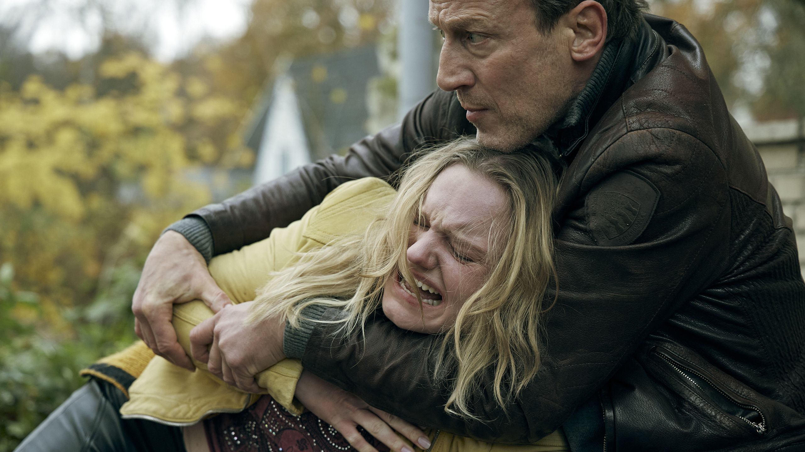 Die Schwester des Verdächtigen René Kowalski, Nora (Maria Dragus) ist außer sich; Kommissar Falke (Wotan Wilke Möhring) versucht, sie zu beruhigen.